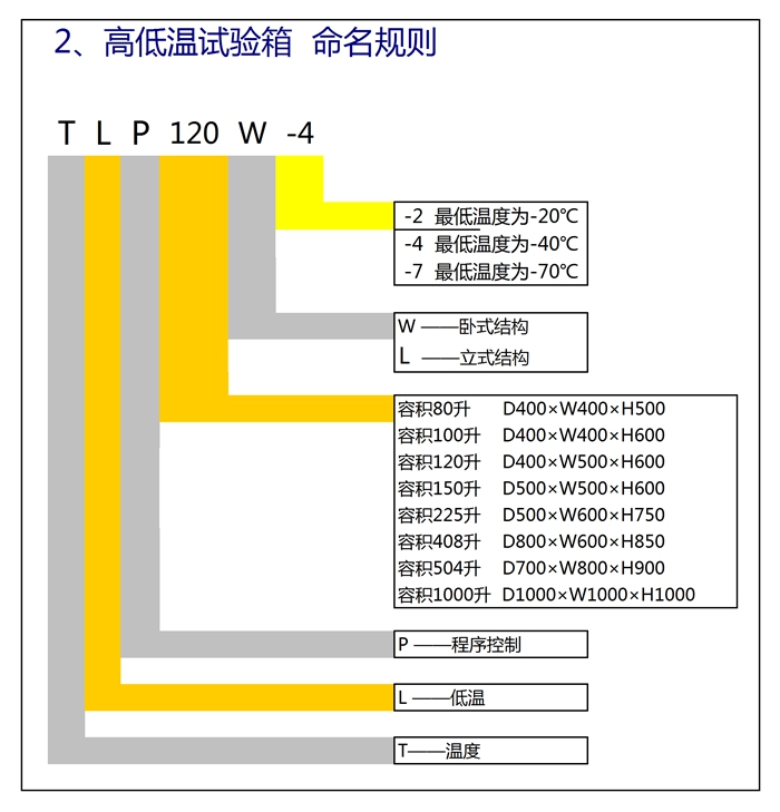 深圳市富易達(dá)儀器有限公司專業(yè)生產(chǎn)系列化、標(biāo)準(zhǔn)化的高低溫試驗(yàn)箱等環(huán)境試驗(yàn)箱、試驗(yàn)設(shè)備,其中高低溫試驗(yàn)箱TLP系列產(chǎn)品主體結(jié)構(gòu)分成臥式和立式結(jié)構(gòu),這里對(duì)TLP系列高低溫試驗(yàn)箱的命名規(guī)格進(jìn)行說明,方便客戶選擇富易達(dá)儀器公司高低溫試驗(yàn)系列產(chǎn)品的時(shí)候參考。