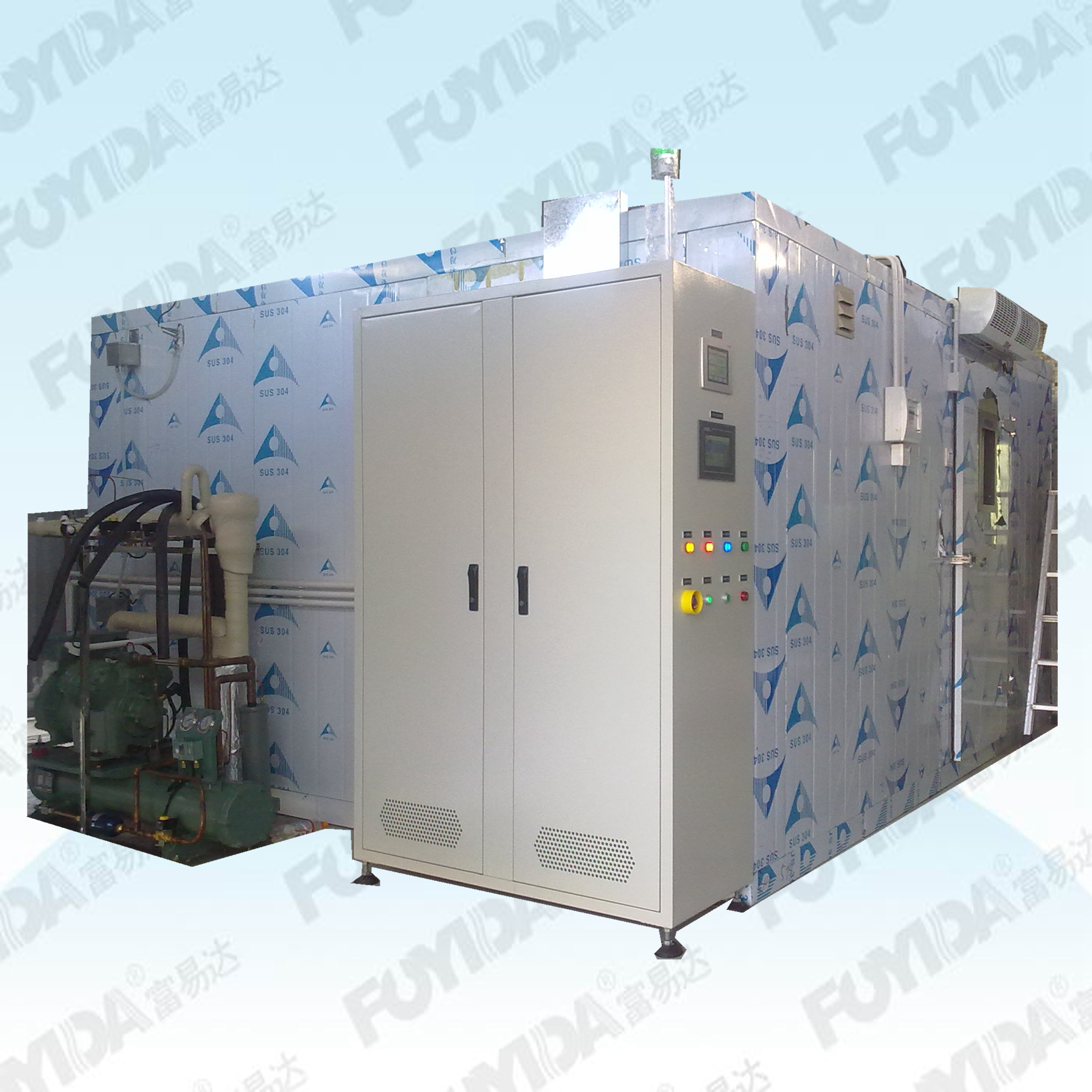 此款步入式高低溫濕熱試驗室是根據(jù)客戶的技術要求和試驗條件定制的,控制方式采用傳統(tǒng)的平衡調溫調濕控制系統(tǒng)(BTHC),以P.I.D.方式控制 SSR,使系統(tǒng)之加熱加濕量等于熱濕損耗量,故能長期穩(wěn)定的使用.